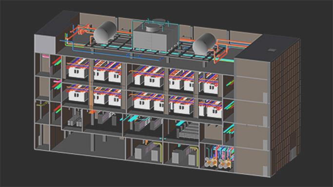 BIM规划具有合理性是项目的关键,瑞立欣的专业团队通过应用BIM评估考量地理位置,能源,气候,收益性风险等因素的合理性,建立项目BIM体量模型,依据模型分析判断项目与数据中心整个所在园区各单体间的适宜性,以及建筑的体量大小、高度和形体关系,并运用软件进行初步的日照和通风模拟分析。通过BIM3D可视化改善项目沟通环境,提高项目的可观赏度及阅读能力,增加建筑的真实性与体验感,尤其对于数据中心复杂机电系统的展示大有裨益。
